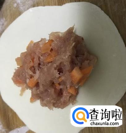 放入馅料。接着往饺子皮中放入适量的馅料,这个根据个人口味来放,多少都可以,但是不宜超出饺子皮的大小,否则很容易漏出来。
