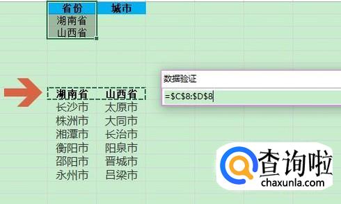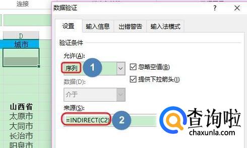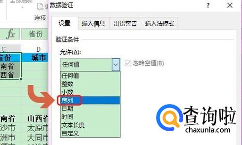 在弹出的数据验证对话框,我们将“允许”设置为序列,然后将“来源”设置为下图列表中的省份;