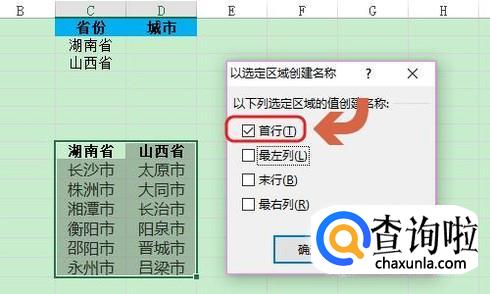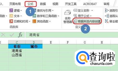 关闭定位条件对话框以后,接着点击“公式”-“根据所选内容创建”,在以所选区域创建名称窗口,我们只勾选其中的“首行”即可,见图二;