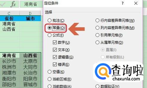 接着按住快捷键Ctrl+G切换出定位对话框,然后点击对话框左下角的“定位条件”,在定位条件对话框勾选“常量”,如下图...
