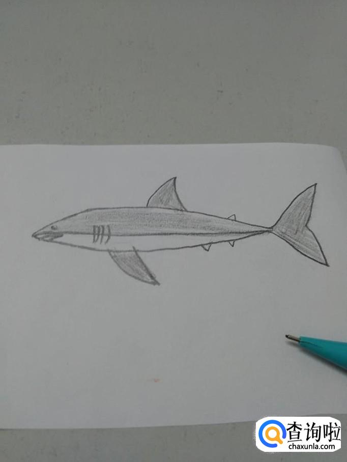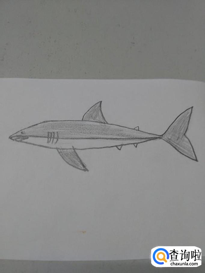 最后,用笔将鲨鱼的身体,除了腹部以外的部分涂上颜色,大白鲨就画完了。