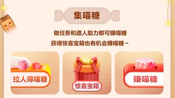 用户可通过“做任务赚喵糖”和“拉人助力”等方式收集喵糖,每种方式对同一用户每天可获得的喵糖数量以及参与次数存在限制,具体以互动界面说明和互动结果为准。其中拉人助力中,分享者才有机会获得喵糖,同一分享者和被分享者之间每天只可以互相助力一次,并且每天每个用户最多仅可为6名好友助力,拉人助力所获得的喵糖数量以页面实际为准。