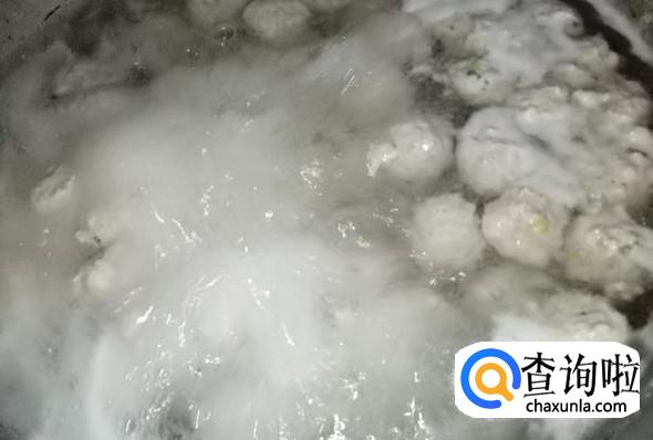 锅内加水,大火烧沸,然后左手把肉馅挤成丸子,右手执勺子把丸子放到锅内。待丸子浮起,捞出即可。