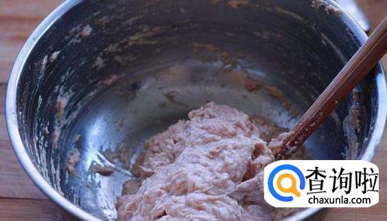 在肉馅内再次加入适量的盐、胡椒粉、料酒搅拌均匀,然后打入一个鸡蛋清,再次搅拌。