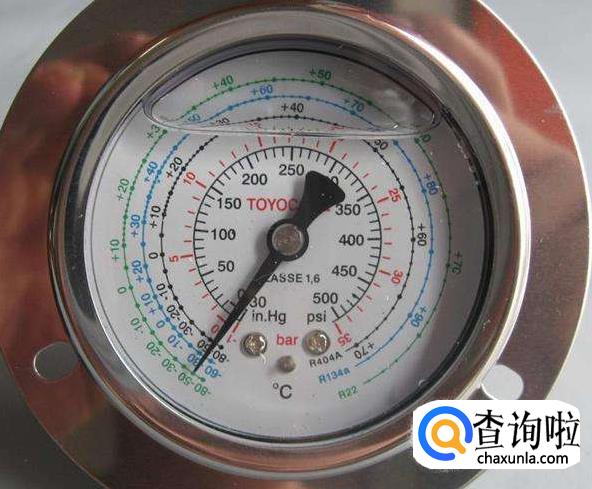空调压力表上的刻度是压力,通过压力显示可以知道压缩机的排气压力(高压)和进气压力(低压),判断系统的运行是否正常,如系统堵塞,冷媒泄露等故障,可以及时通过看表上读数,进行预判。