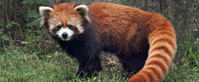 小熊猫体形肥胖体长40~60厘米,体重约6千克。全身呈红褐色,四肢呈棕黑色,体毛长而蓬松,脸圆,具白色斑纹,唇、耳缘和颊白色,脸上有白斑,眼鲜艳;尾粗,长超过体长之半,具9个环纹。