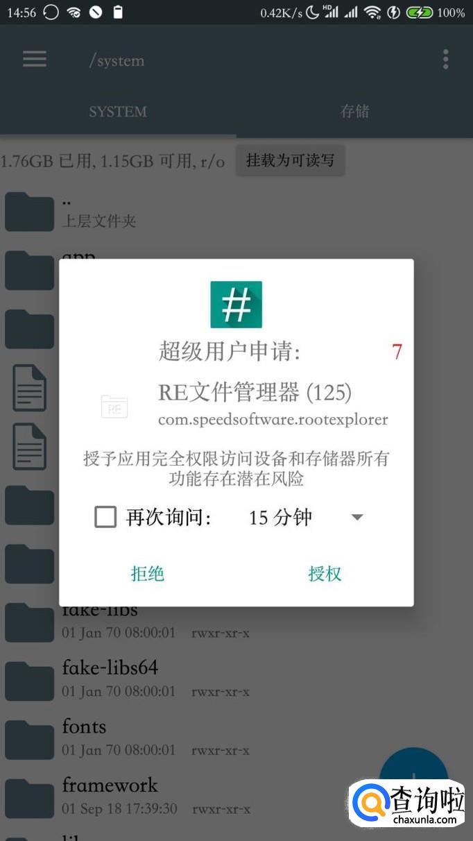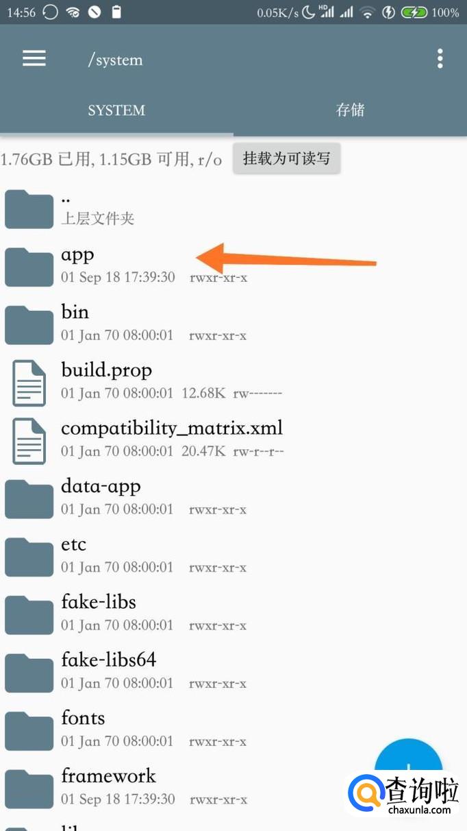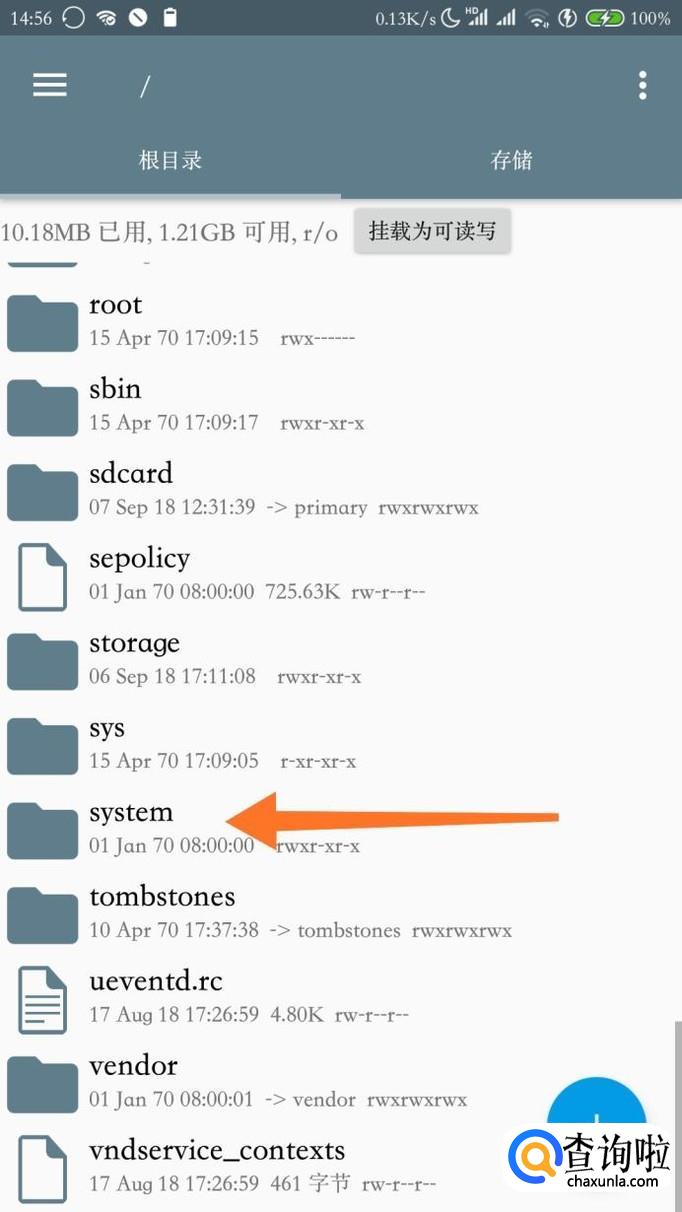 授予root权限之后,点击“根目录”,然后找到system文件夹。
