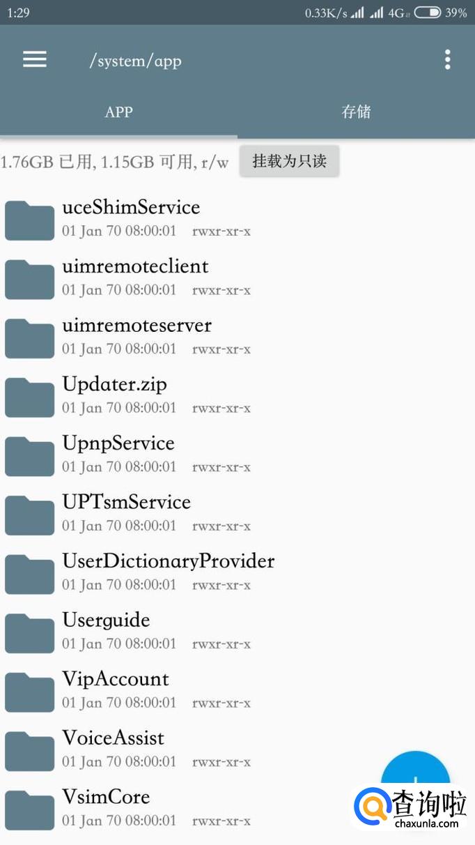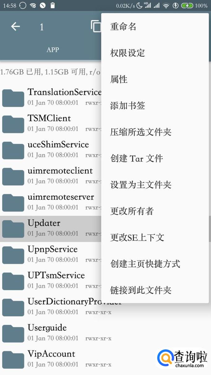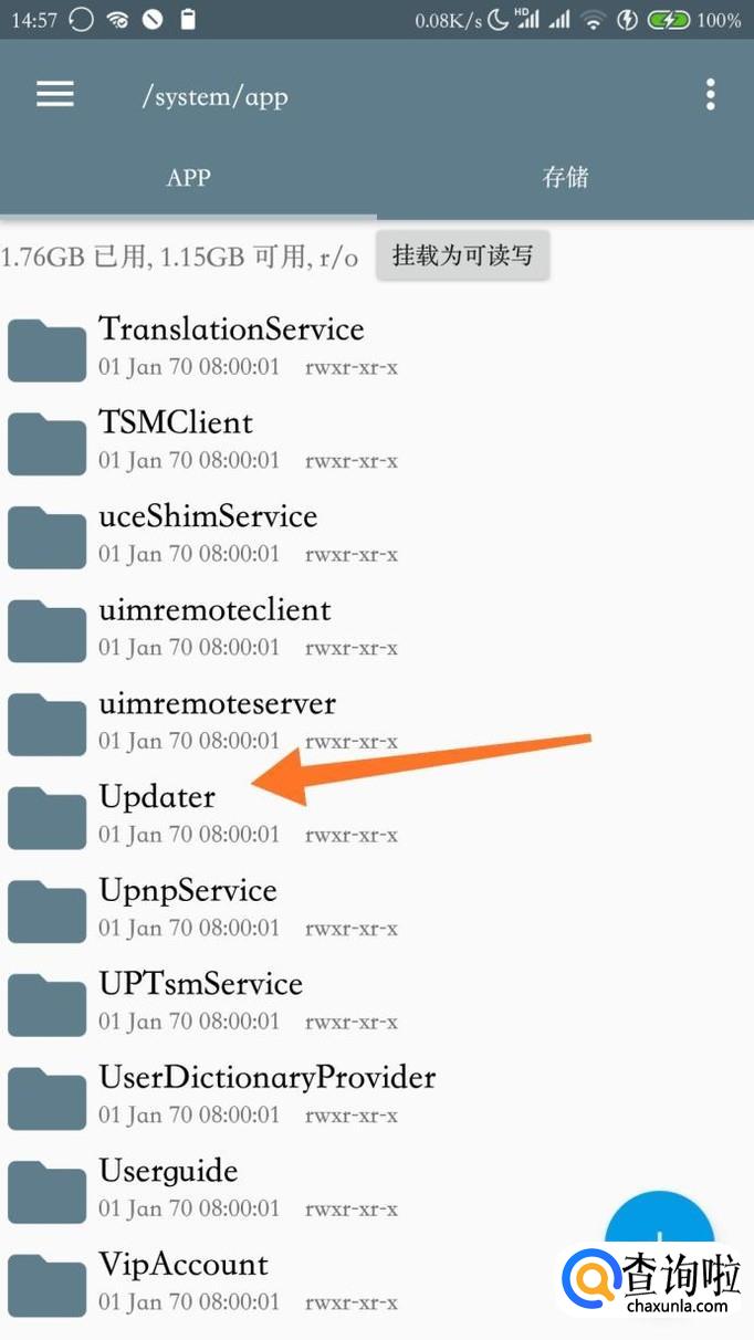 点击“app”子文件夹,找到“updater”,长按,点击右上角的“重命名”,把后缀加一个“.zip”即可删除系统更新功能,如图所示,现在已经不能进入系统更新了。