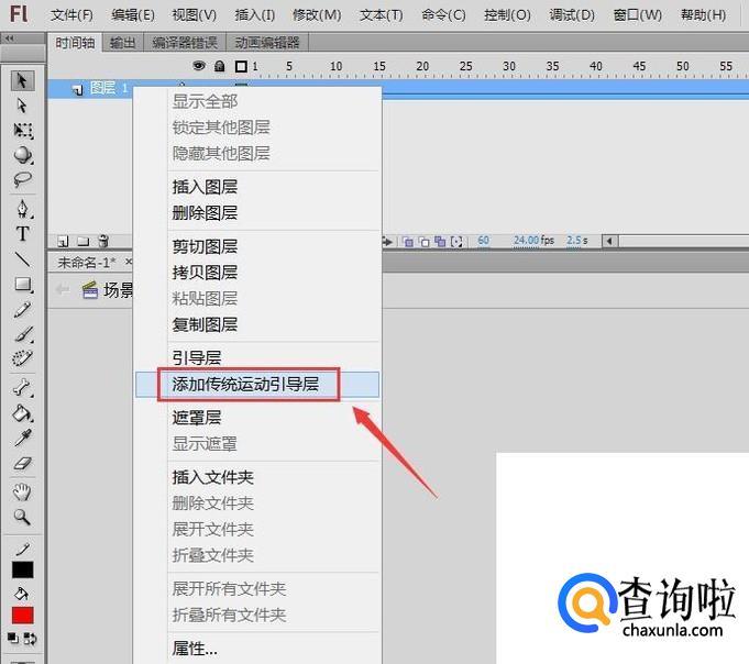 然后我们再在图层1上单击鼠标右键在右键菜单那里找到添加传统运动引导层选项,如图所示:
