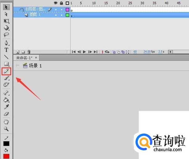 点击添加传动运动引导层选项添加引导层啦,后再在工具箱内找到画笔工具,如图所示: