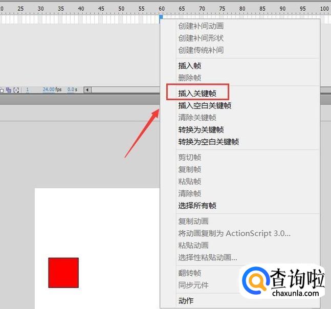 使用矩形工具在舞台上绘制出一个矩形,然后在时间轴的第60帧处单击鼠标右键在右键在菜单里找到插入关键帧选项,如图所示: