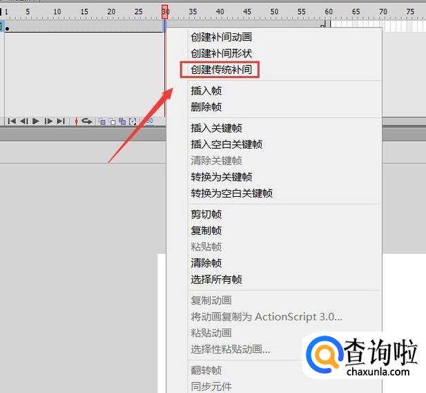 插入关键帧之后,然后将矩形移动到右下角,然后在第一帧和第60帧处再单击鼠标右键在右键菜单里找到插入传统补间动画选项,如图所示: