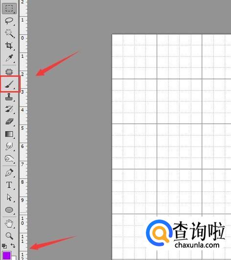 点击网格将网格显示出来,然后再在工具箱内找到画笔工具并设置其颜色,如图所示: