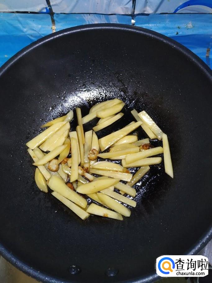 将准备好的土豆条,控干水分,倒入锅中,小火慢煎,土豆很快就粘上一层焦糖色。