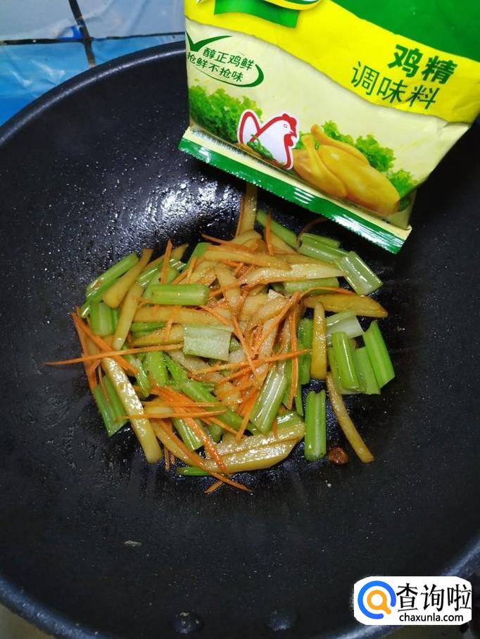 将胡萝卜丝,倒入锅中翻炒均匀,胡萝卜不仅营养,而且可以让菜肴的色泽更加好看。