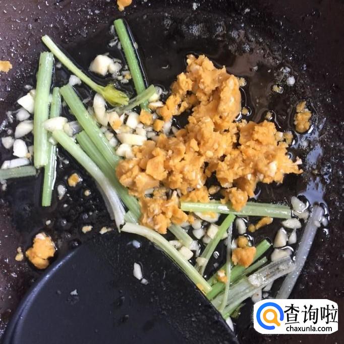 然后把蒸好的蛋黄捣碎倒入锅中翻炒至起泡,如下图所示。