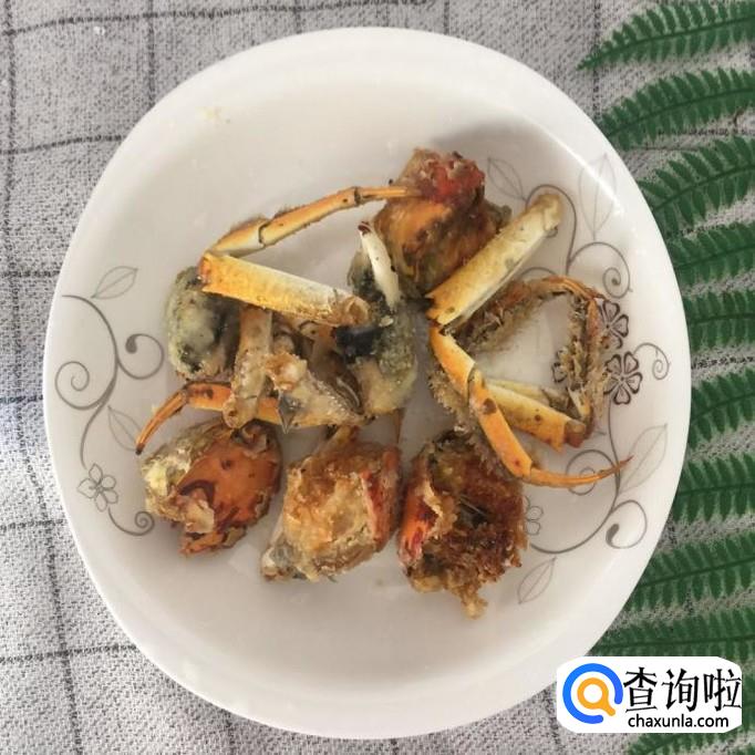 接着锅中放入适量的食用油,待油烧至七分热,倒入螃蟹炸五分钟,如下图所示。