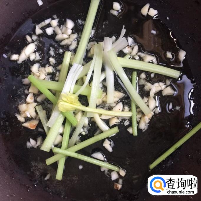 接着往油锅中倒入蒜蓉和芹菜爆香,如下图所示。