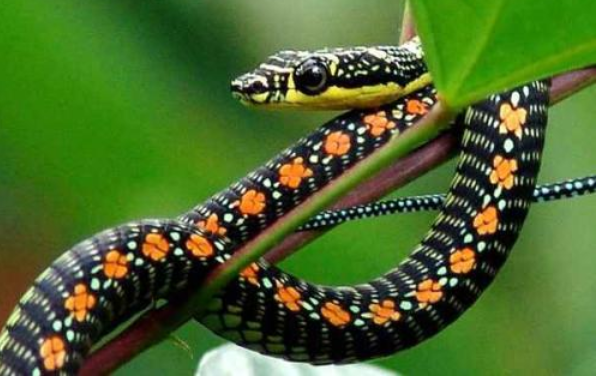 金花蛇是一种珍稀蛇类,分布于我国广东、福建、云南等省,以及印度、斯里兰卡等国。它身长1.1〜1.4米,眼圆大有神,身体背部黑色斑纹中镶嵌着许多红、黄色的彩纹,十分好看,因此有“美丽金花蛇”的称号。