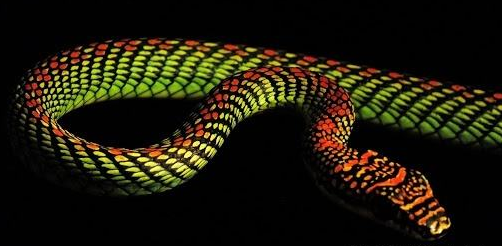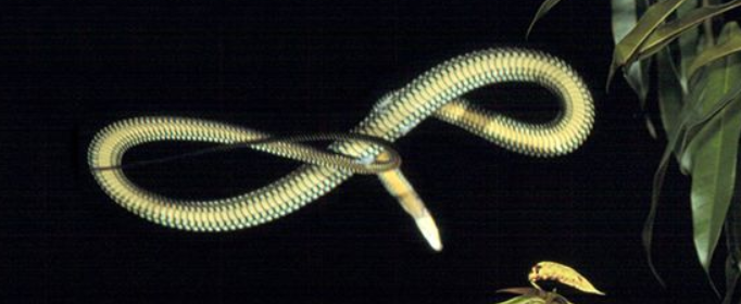 严格地说,金花蛇的“飞行”算不上是真正的飞行,只是一种滑翔罢了。它要爬高后再滑翔,但不能着地就起“飞”。