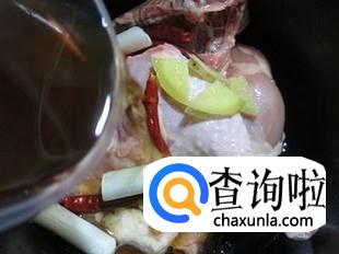 锅里面不用放油,直接把刚刚腌制的鸡腿和汁倒入锅里面,放上几个八角,然后加上足够的水,根据口味适当调味,然后盖上盖子大火烧开。