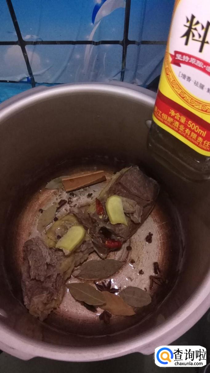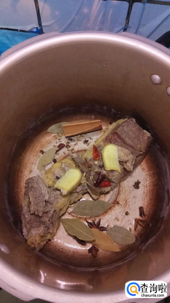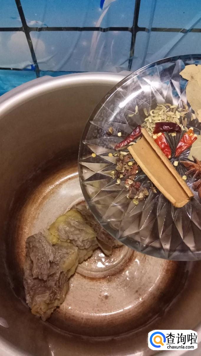 将焯好的牛肉放入高压锅中,然后放入花椒,八角,小茴香,桂皮,干辣椒等大料。
