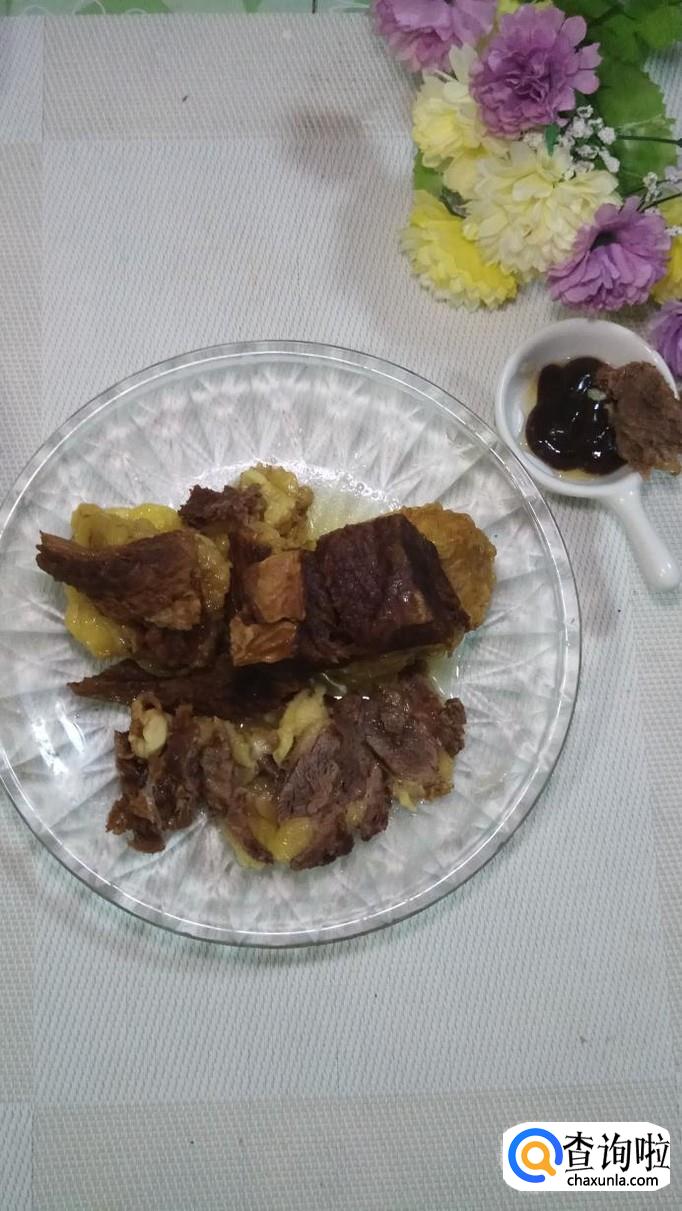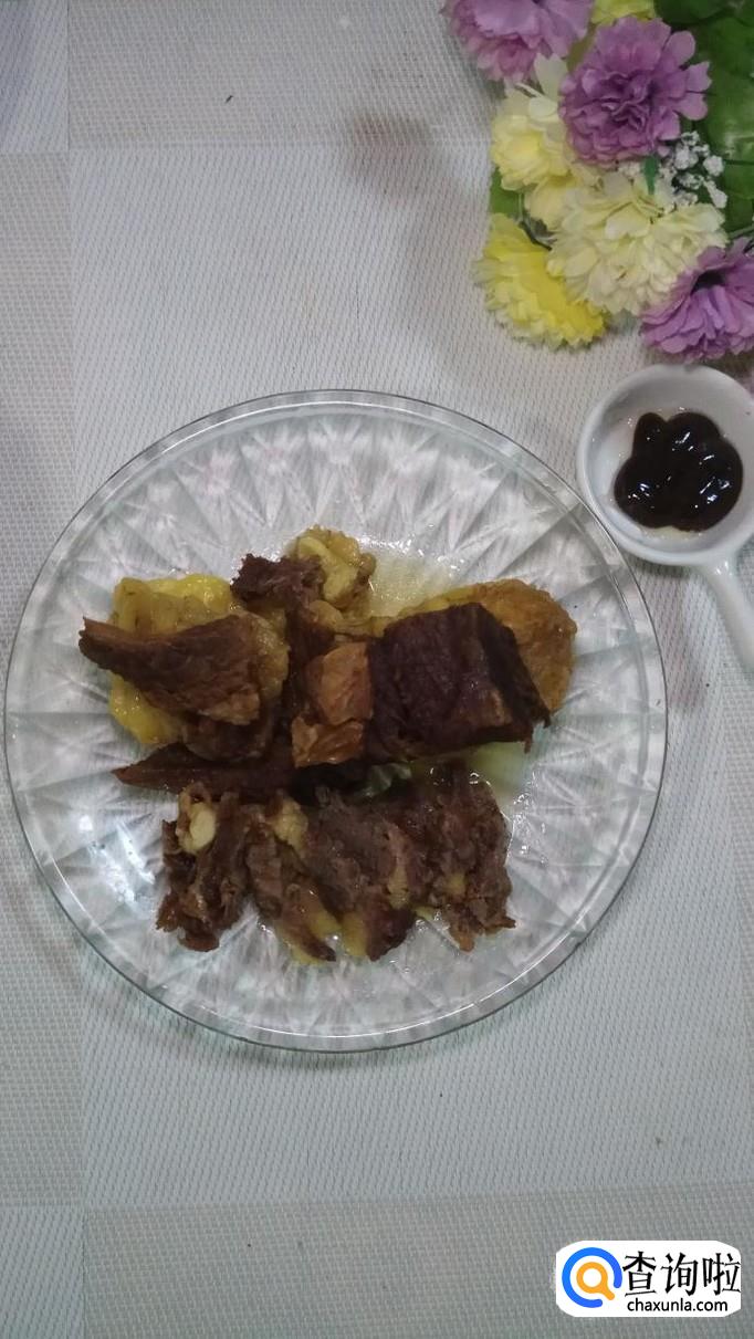 将做好的牛肉取出放入盘中,还可以放入冰箱,稍微冷冻一下,这样便于切片,将切成片的牛肉蘸上黑椒酱就可以吃了,真的特别美味。