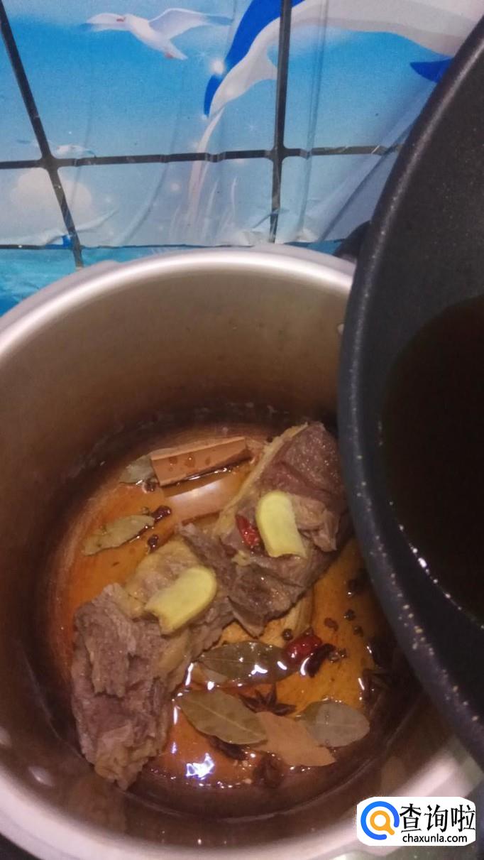 看到熬出糖色后,迅速加入清水,将糖色水倒入高压锅中,最好能够没过牛肉。