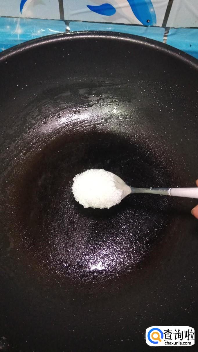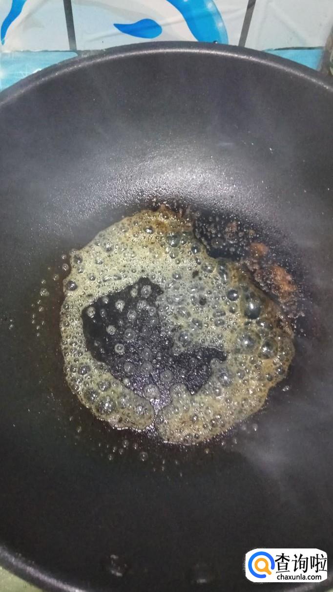 炒锅中放入一勺白砂糖,然后再加入少量的清水,小火慢熬,熬至大泡变小泡,熬出糖色。