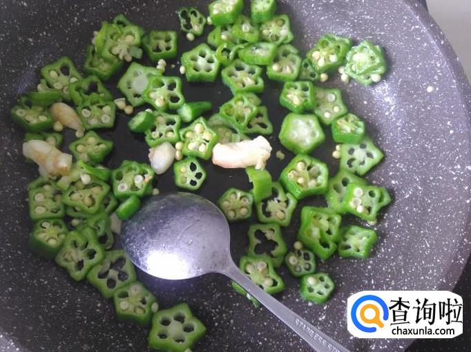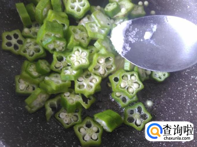 然后放秋葵进锅,加适量的盐翻炒2分钟左右,熄火。
