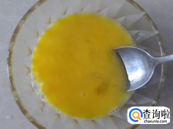开火下油,倒鸡蛋糊进去,用小火煎,一边煎一边轻轻摇动平底锅,不给粘锅。