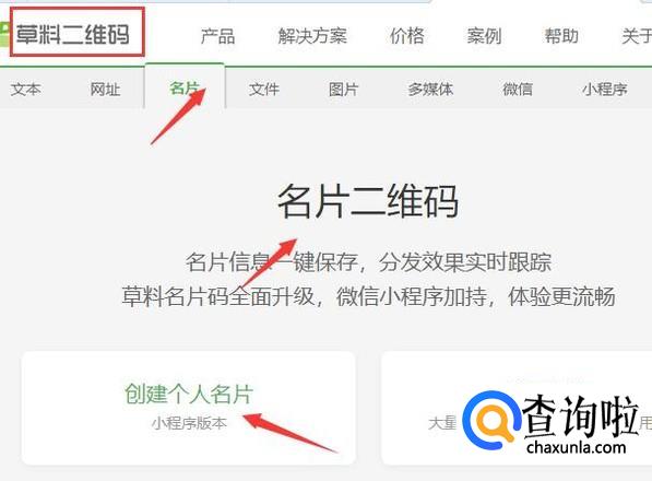 首先我们在网上搜索草料二维码生成器。利用这个软件去生成一个二维码名片。点击“创建个人名片”。