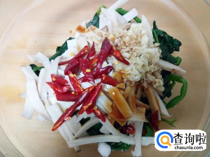 把焯好的菠菜,杏鲍菇放入碗里,放入一匙儿蚝油,一匙儿蒸鱼豆豉油,放入味精,少许白糖,少许陈醋。再把切好的红干椒,蒜末,放在上面,不用放盐。