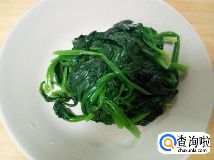 菠菜用水焯一下,水开后入锅30秒钟捞出,迅速用冷水过凉,沥干水分,然后再用手攥一下菠菜里的水分。