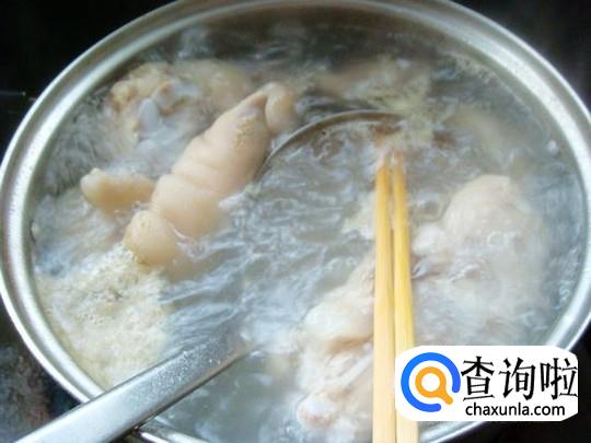锅中烧开水在里面放入猪蹄,煮3分钟。