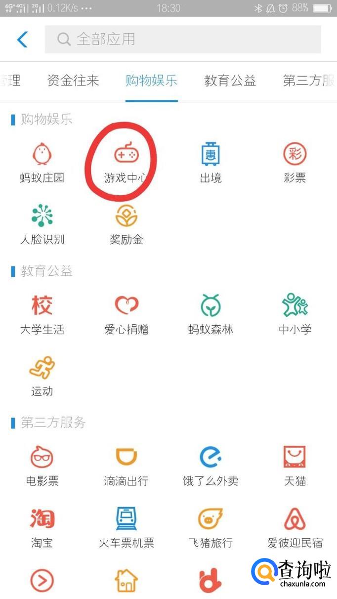 在支付宝应用中找到购物娱乐中的“游戏中心”,点击进入操作,如下图红色标注的地方。