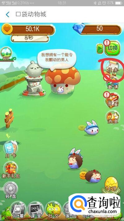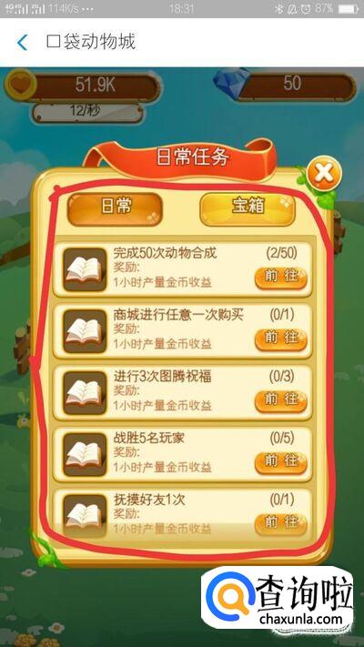 在口袋动物城游戏中,点击“任务”,我们可以进行完成一些日常任务来赚取金币收益。