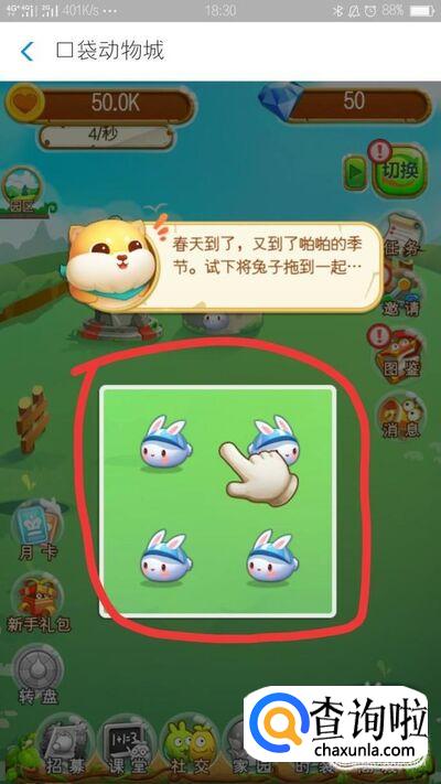 我们进入游戏之后,会有一个提示:春天到了,又到了啪啪的季节。试一下将兔子拖到一起……然后我们把两个宠物进行合体,就可以玩了。