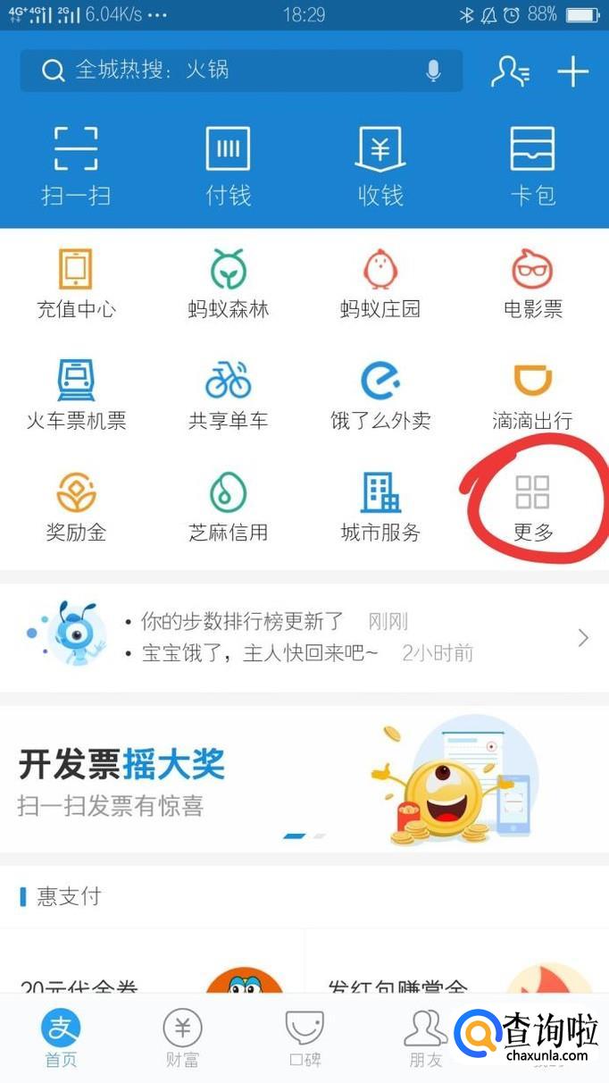 首先需要登录手机支付宝,然后在支付宝首页面中找到“更多”,点击进入这个选项。