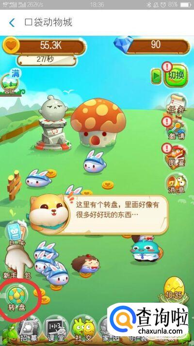 如下图内容所示,我们在口袋动物城首页面中的左下角找到“转盘”,会有提示:这里有一个转盘,里面好像有很多好玩的东西…然后点击进入。