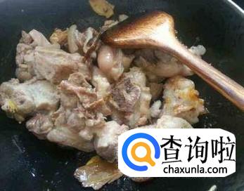 猪脚放入锅中煎炒3分钟,加白酒,老抽少许,炒匀。