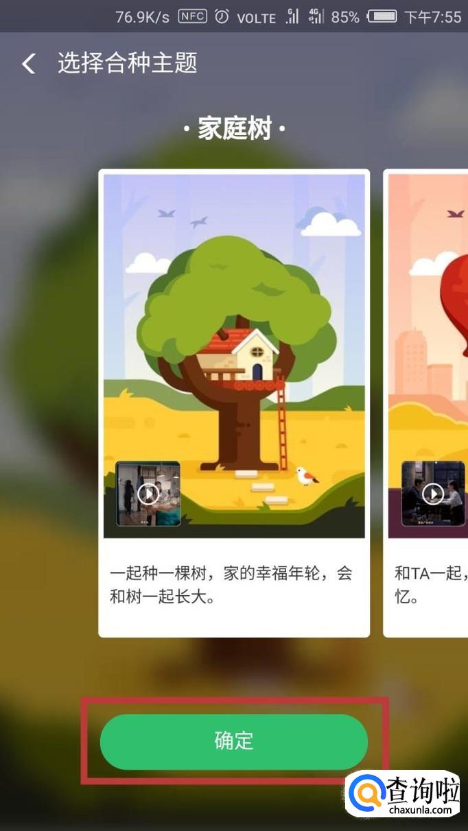 然后选择一个合种类型,有家庭树、爱情树、友情树等类型,选择完成后点击【确定】。