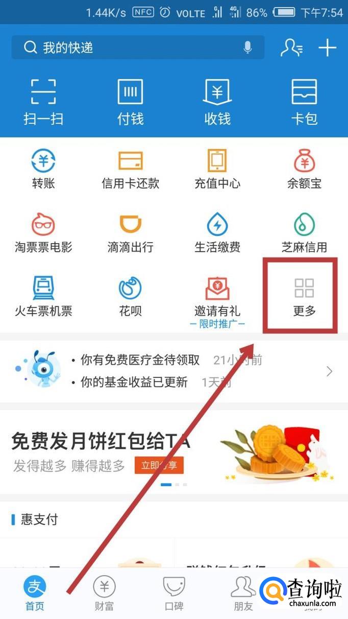 打开支付宝后,在界面中部的选项卡中找到【更多】的一项,点击进入。