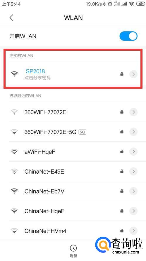 在WLAN设置中发现自己已经连接的WIFI网络,点击网络名称进行分享。