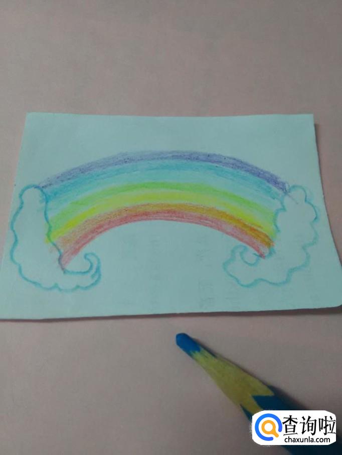 用蓝笔在彩虹两端各画几条连在一起的短弧线,组成一朵云彩,云彩的末端画成钩状,像手一样,托起彩虹,到此,最美彩虹就画完了。