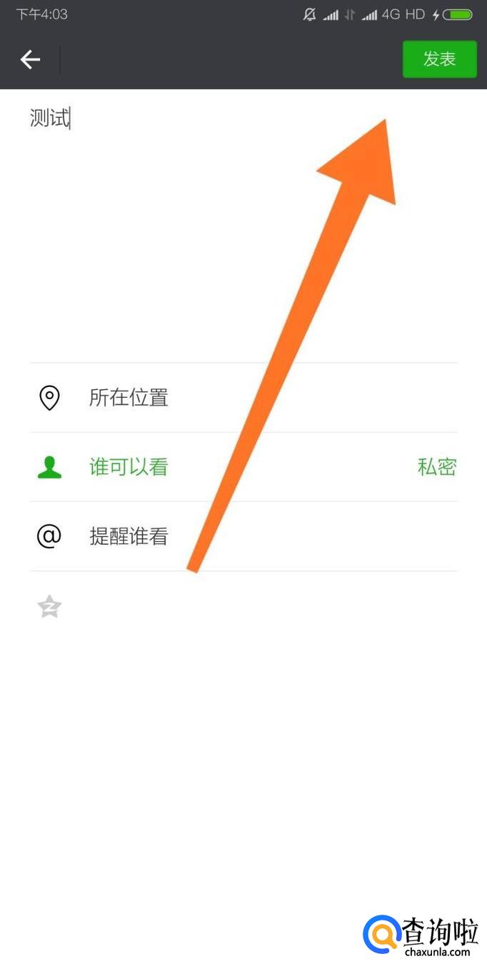 接下来就直接进入了朋友圈动态的编辑页面,而且不需要配图。编辑好文字内容后,点击右上角的“发表”即可。