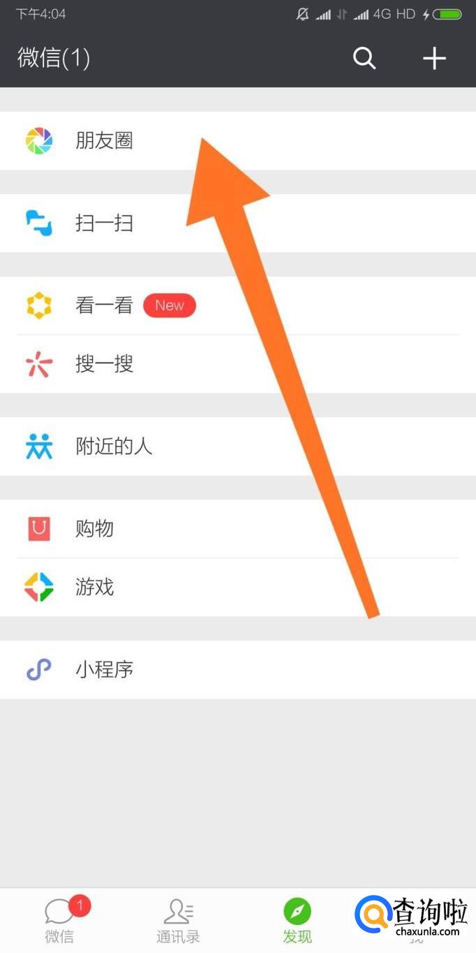 首先进入微信“发现”页面,点击进入“朋友圈”。