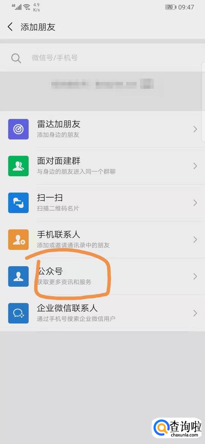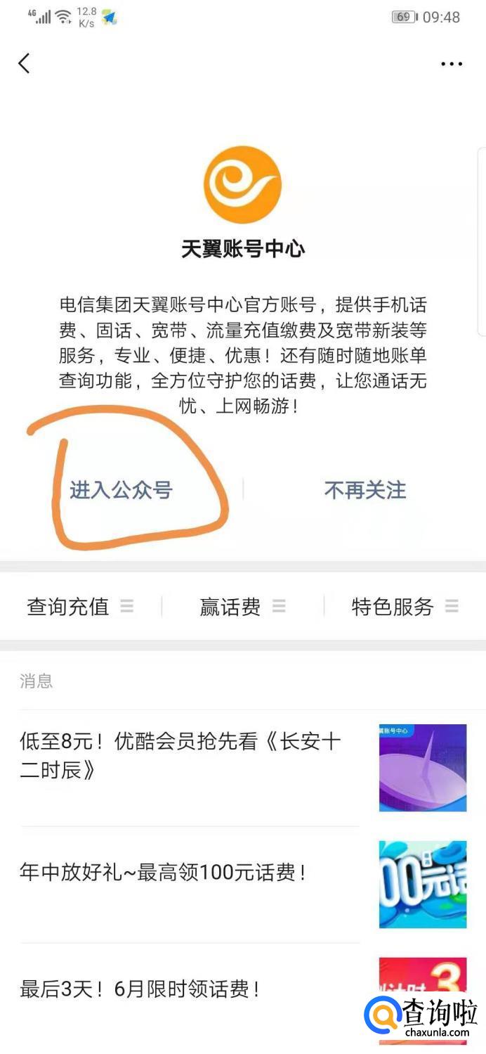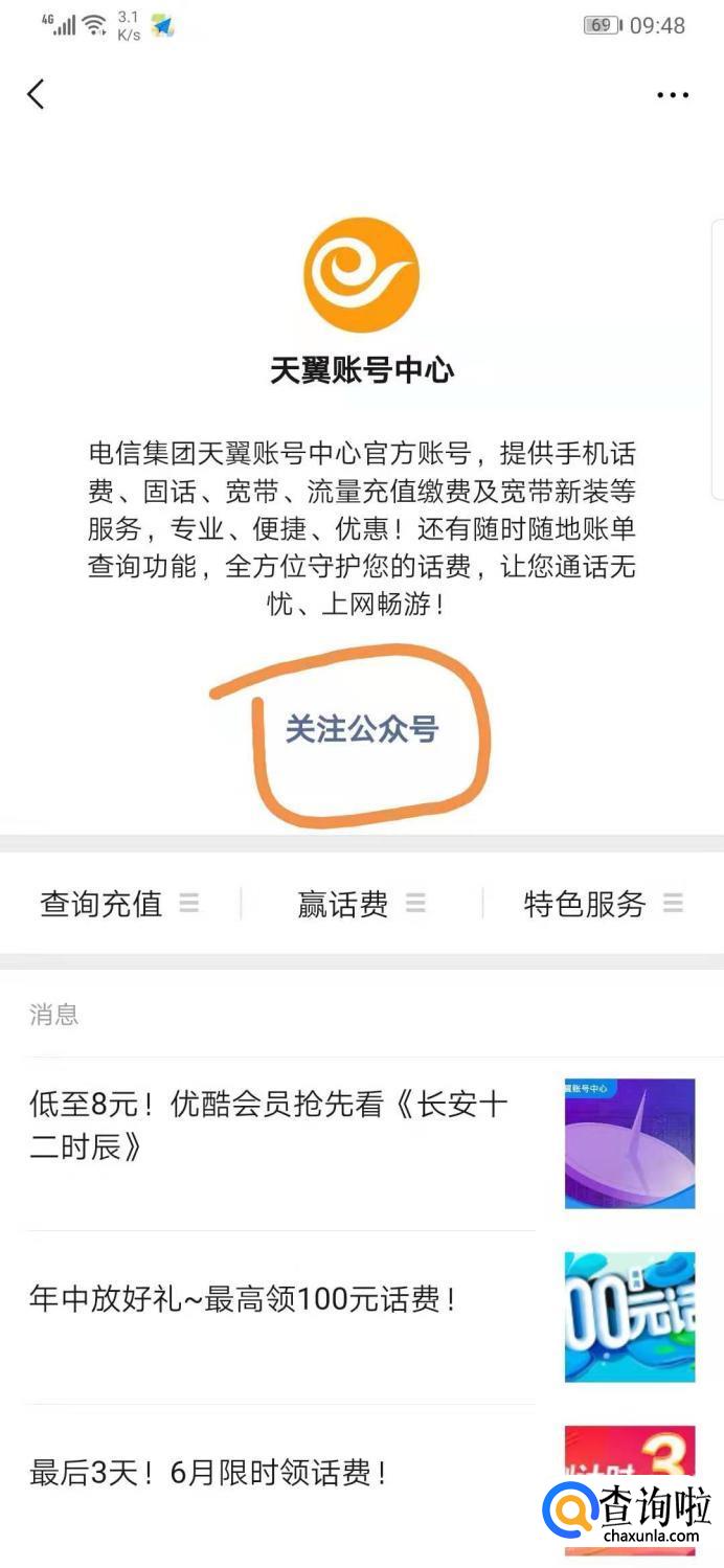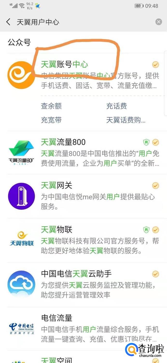 首先我们打开微信,点击右上角”+“号,点击添加公众号,然后在搜索框搜索“天翼用户中心”公众号。