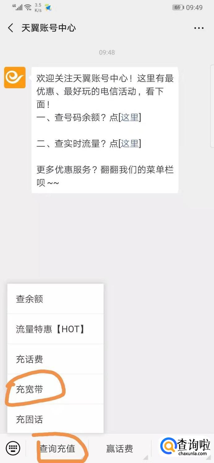 进入公众号后,在下方的菜单栏中选择【查询充值】菜单栏下的【充宽带】,进入充值页面。