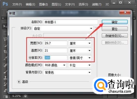 再按Ctrl+N,新建A4大小的文档,设置宽度29.7厘米,高度21厘米,分辨率300像素/英寸,按确定。